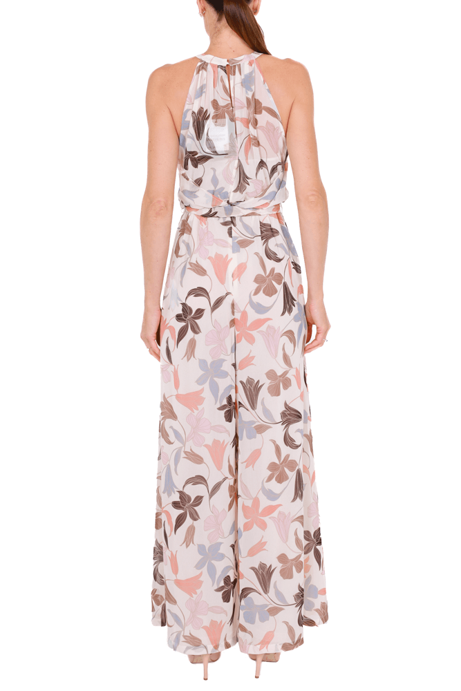 Tuta elegante con scollo all’americana in fluida georgette fantasia, modello con pantalone a palazzo per una vestibilità confortevole arricchito da cinturina in tessuto, ideale anche per una occasione speciale