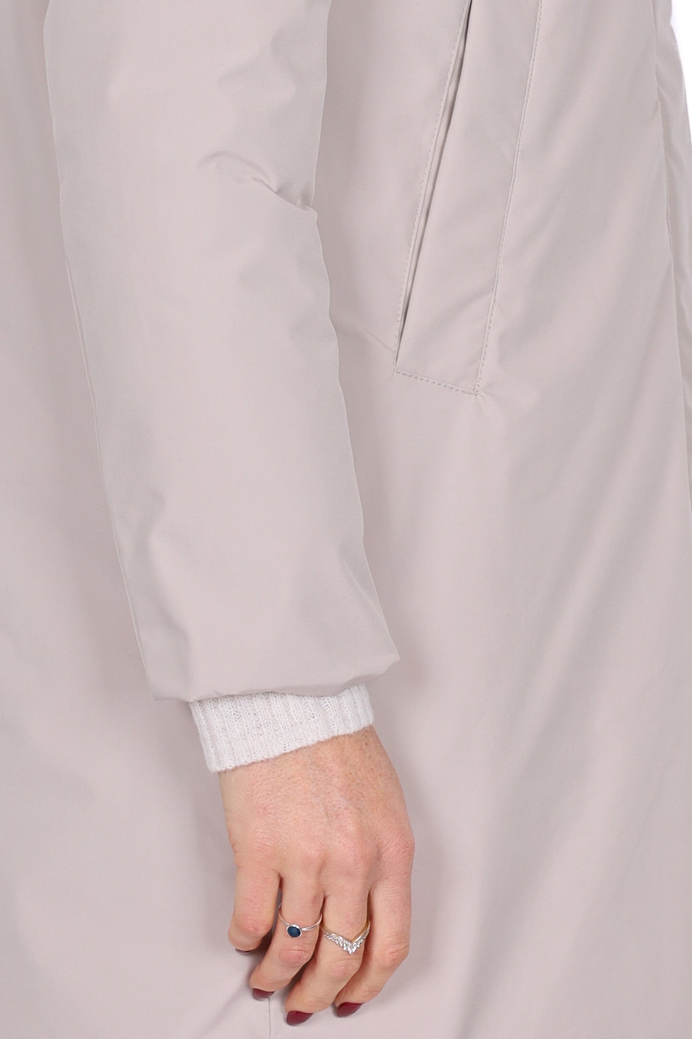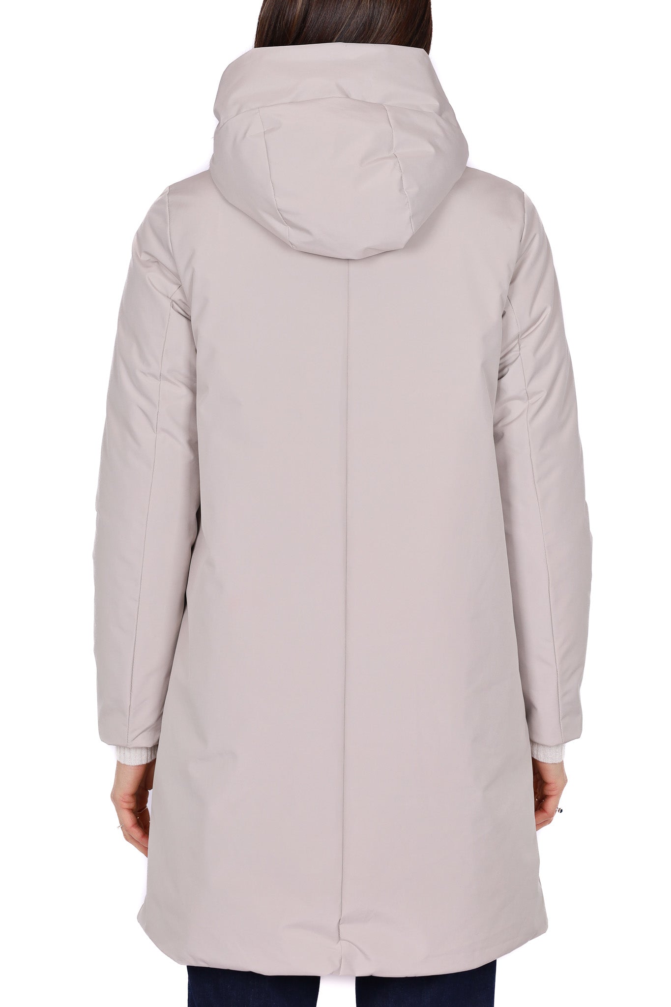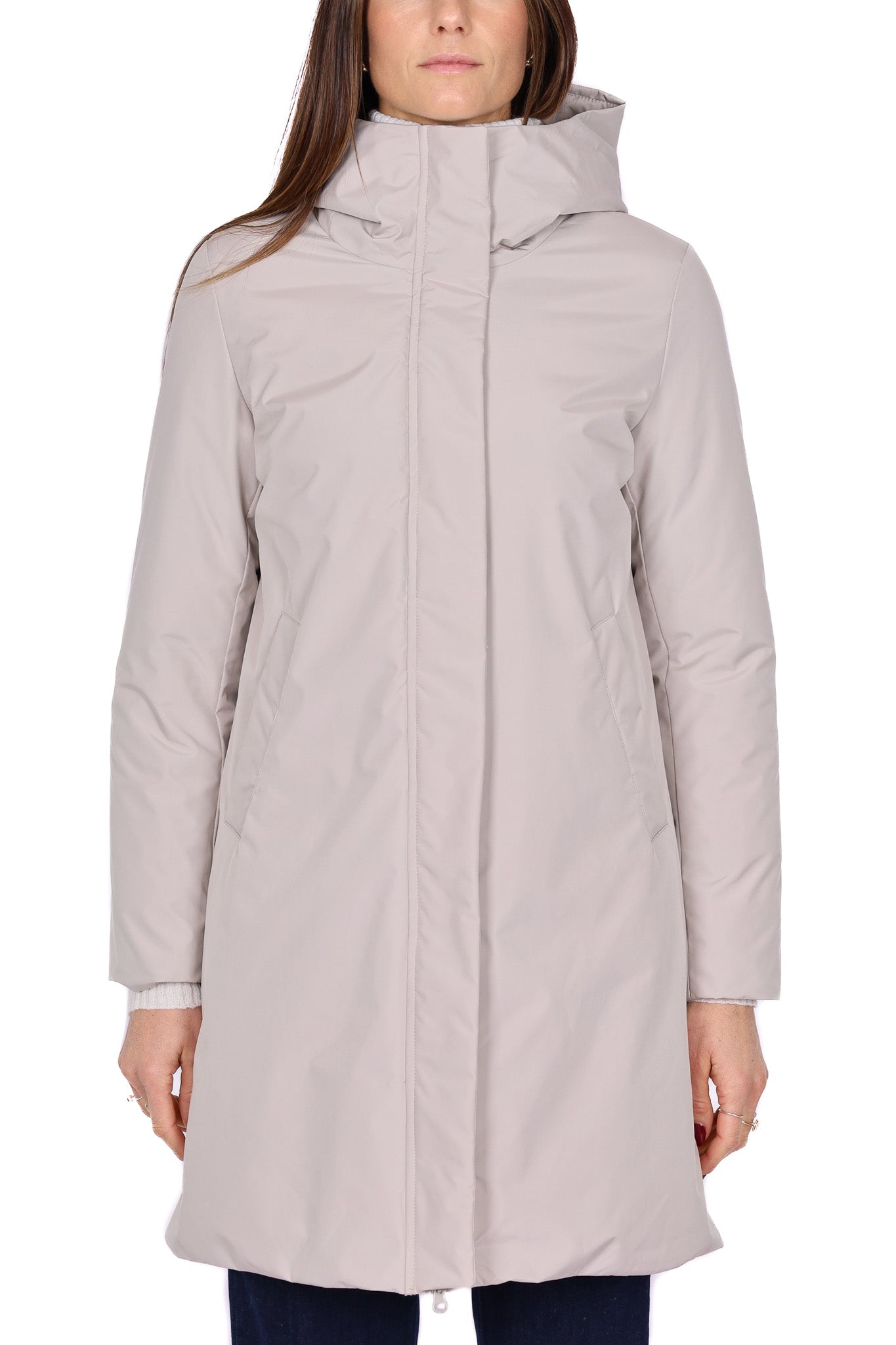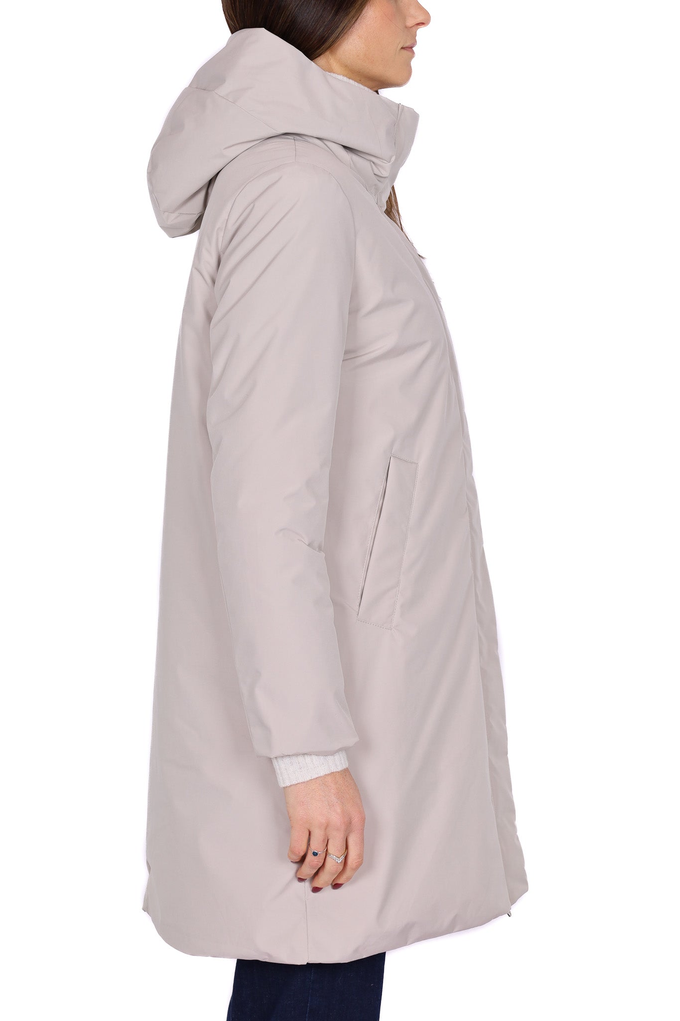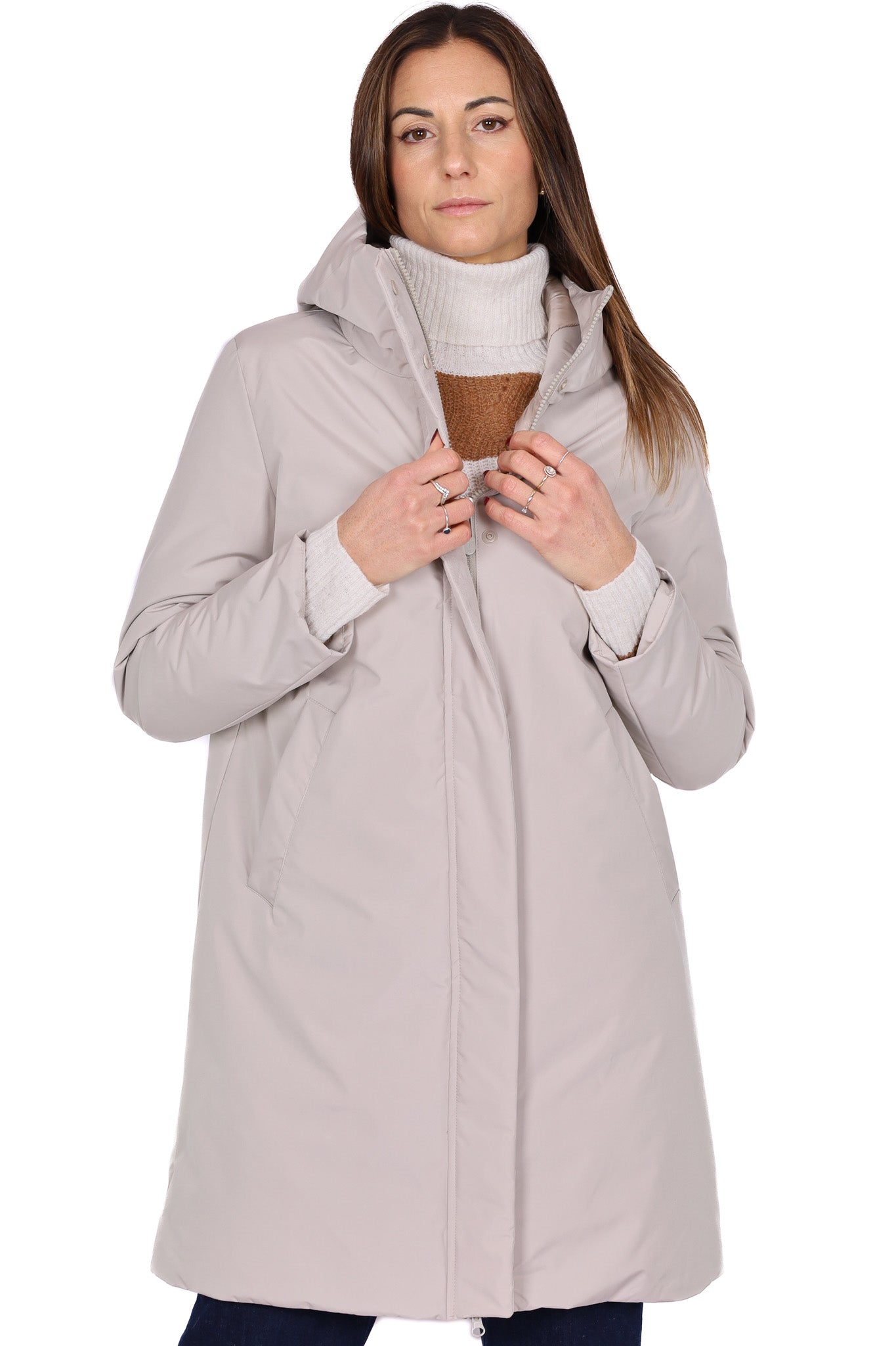 Piumino lungo di colore panna, design essenziale con cappuccio fisso e chiusura frontale nascosta da patta. Il tessuto tecnico leggero e opaco dona un aspetto sobrio ed elegante, mentre la linea svasata garantisce comfort e grande libertà di movimento. Dotato di tasche laterali oblique per una maggiore praticità, perfetto come outerwear invernale per la città o il tempo libero.