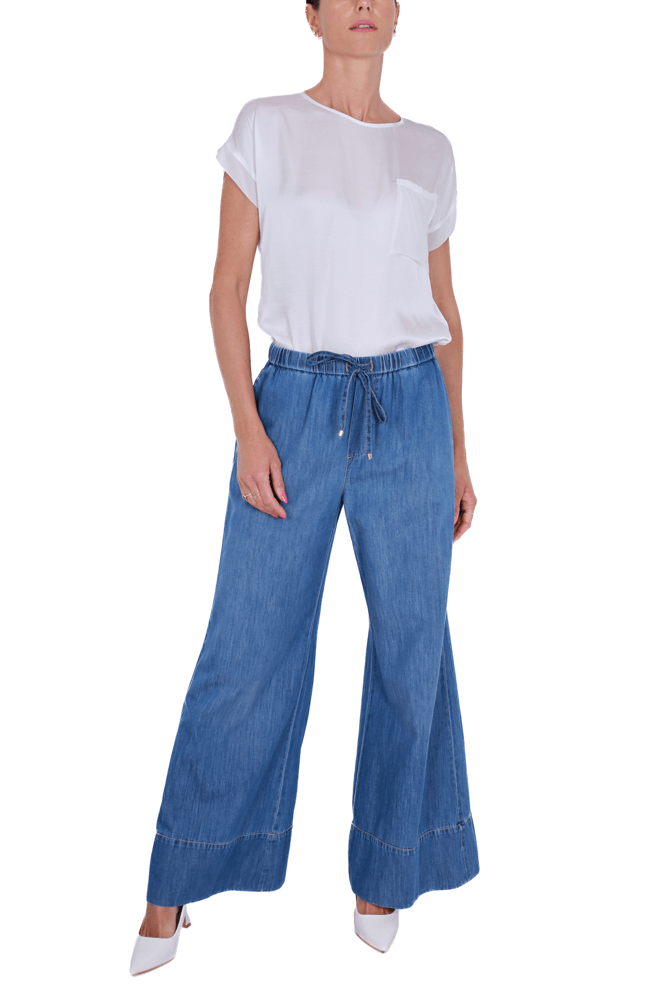 Pantalone a palazzo in jeans leggero lavaggio medio, modello con elastico e coulisse in vita per un look casual ma curato in ogni dettaglio perfetto per la stagione primavera-estate