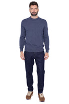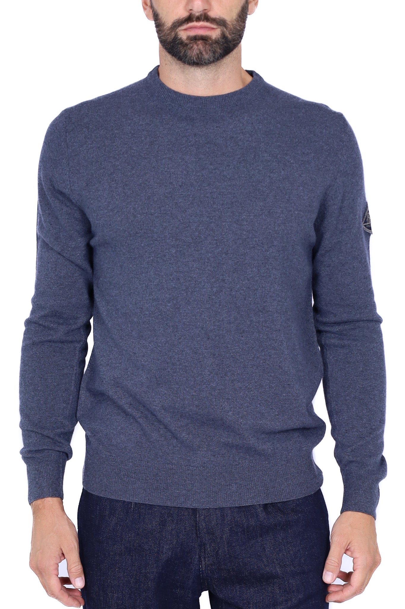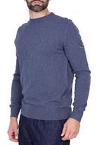 Maglione da uomo girocollo realizzato in pura lana merino, con colore blu mélange e polsi, fondo e collo in maglia a costine per una vestibilità confortevole. Il design essenziale è valorizzato da una patch logo applicata sulla manica sinistra, per un tocco distintivo e moderno. Perfetta per essere indossata con denim o chino sia in contesti casual che nei look più curati.