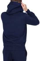 Felpa da uomo in cotone blu navy, con cappuccio regolabile, chiusura a zip e tasca frontale a marsupio. Caratterizzata da dettagli a costine, coulisse bianca a contrasto e piccolo logo lato cuore. Vestibilità comoda per look sportivi e casual, ideale in ogni stagione o sotto una giacca.