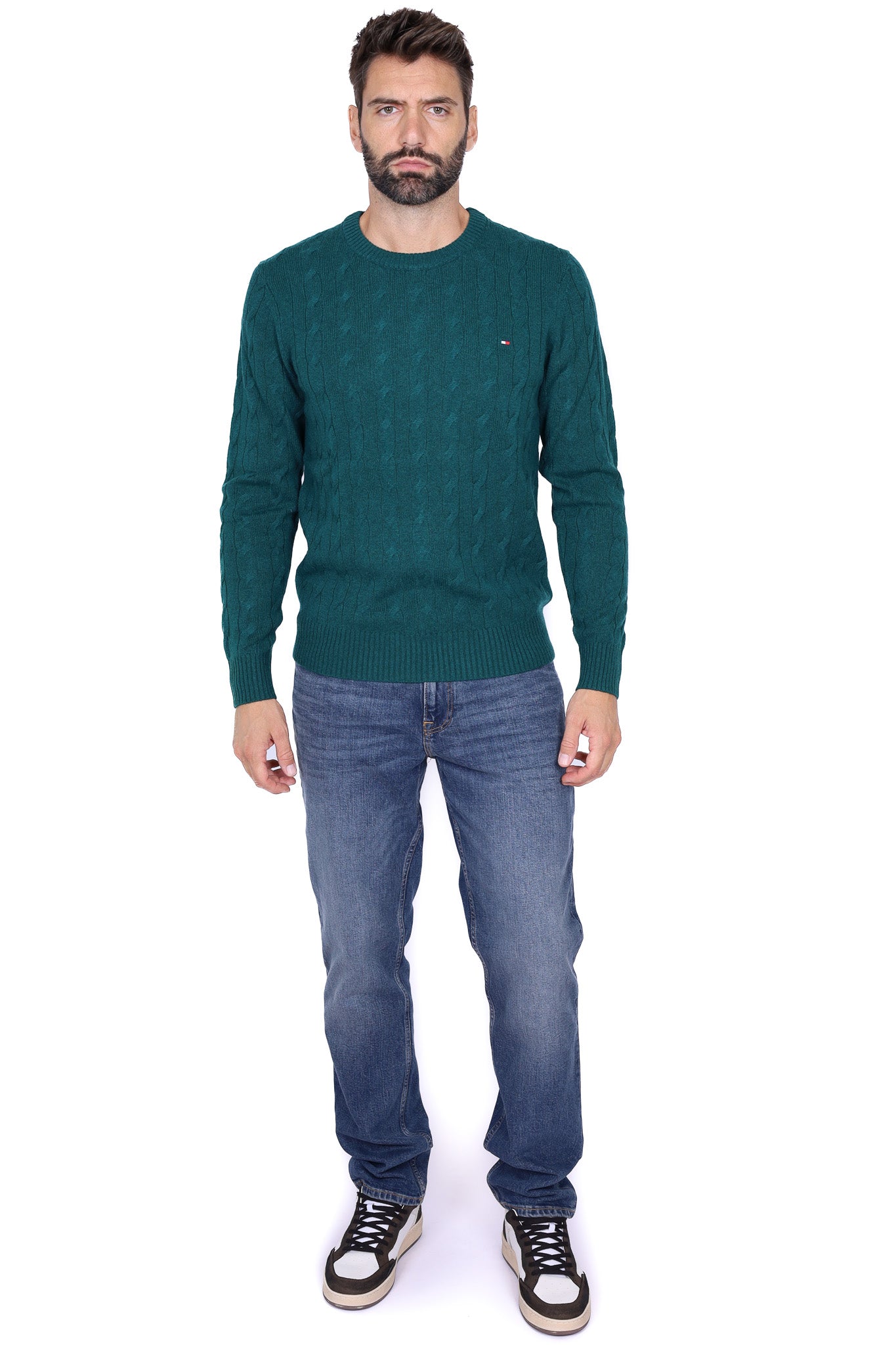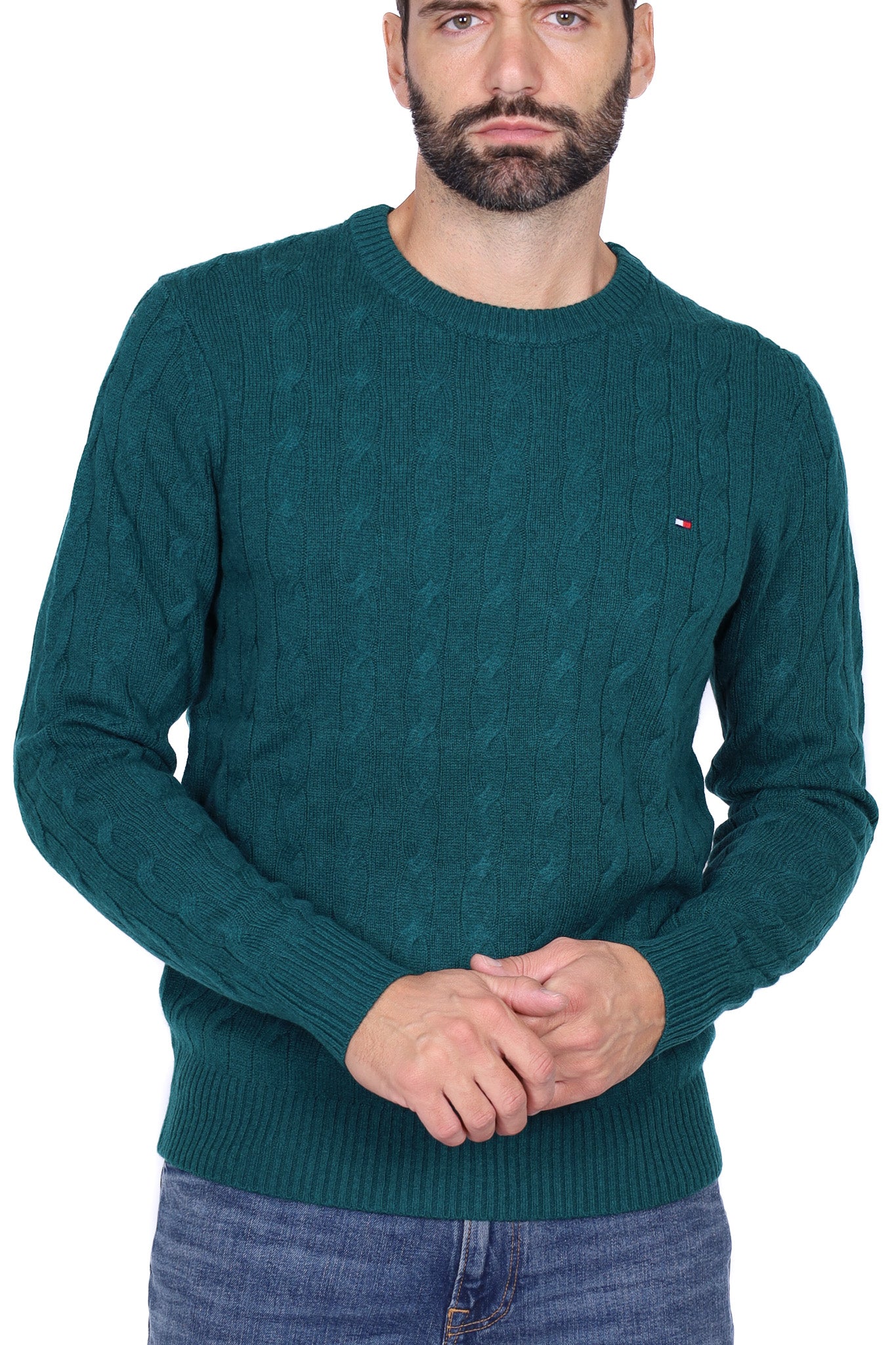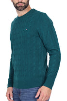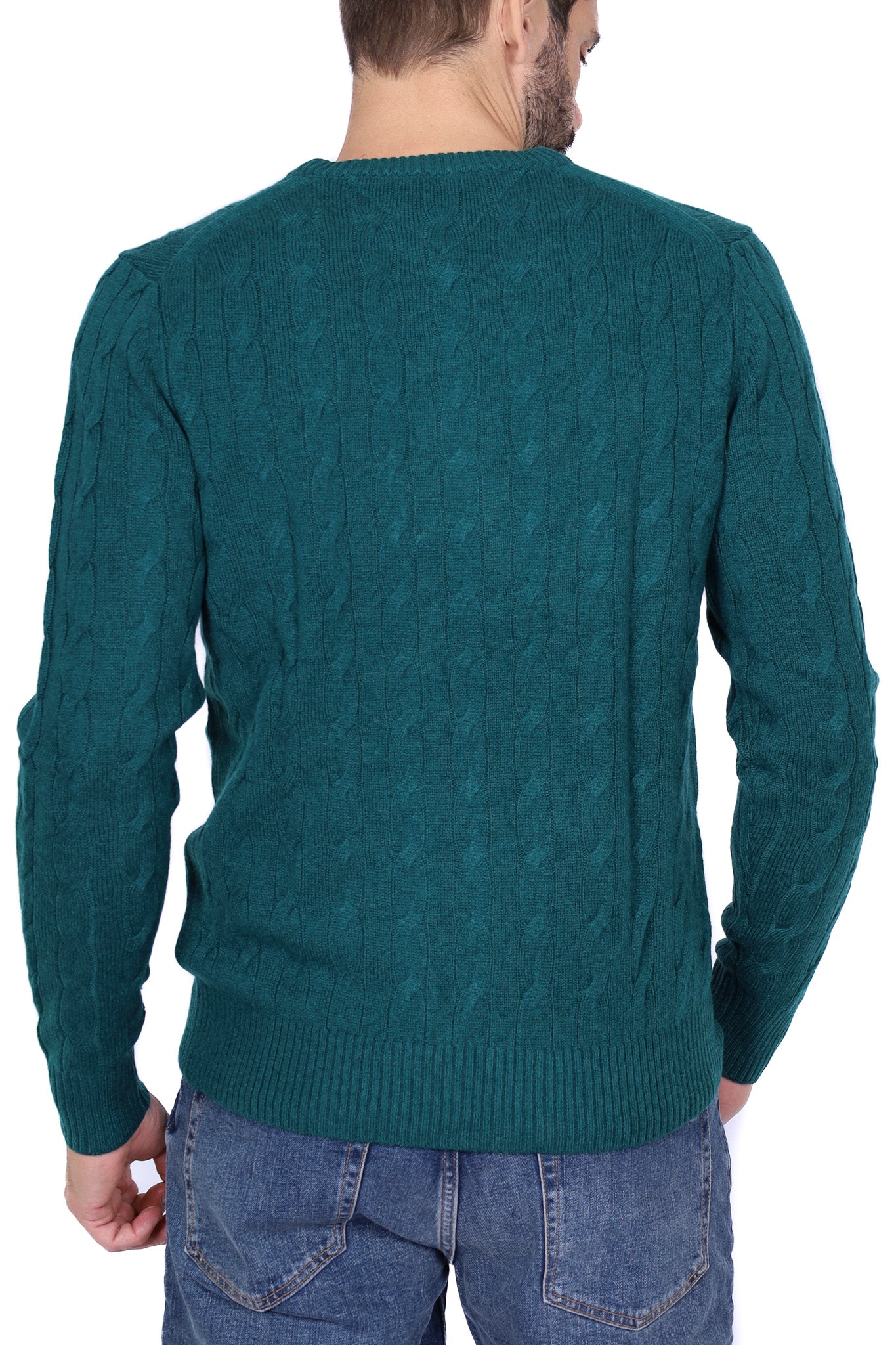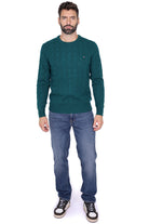 Maglione da uomo in lana con lavorazione a treccia, color verde petrolio, modello girocollo. Morbido e caldo, perfetto per la stagione autunno-inverno, si abbina facilmente sia a look casual con jeans che a outfit più eleganti. Rifinito con bordi a costine e logo ricamato sul petto.