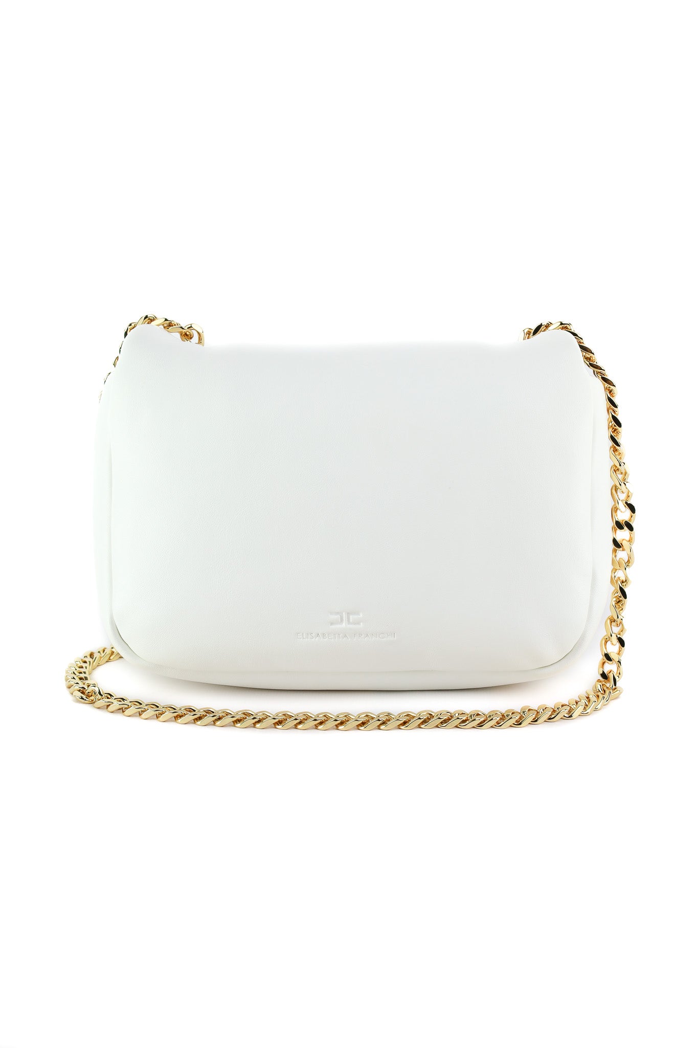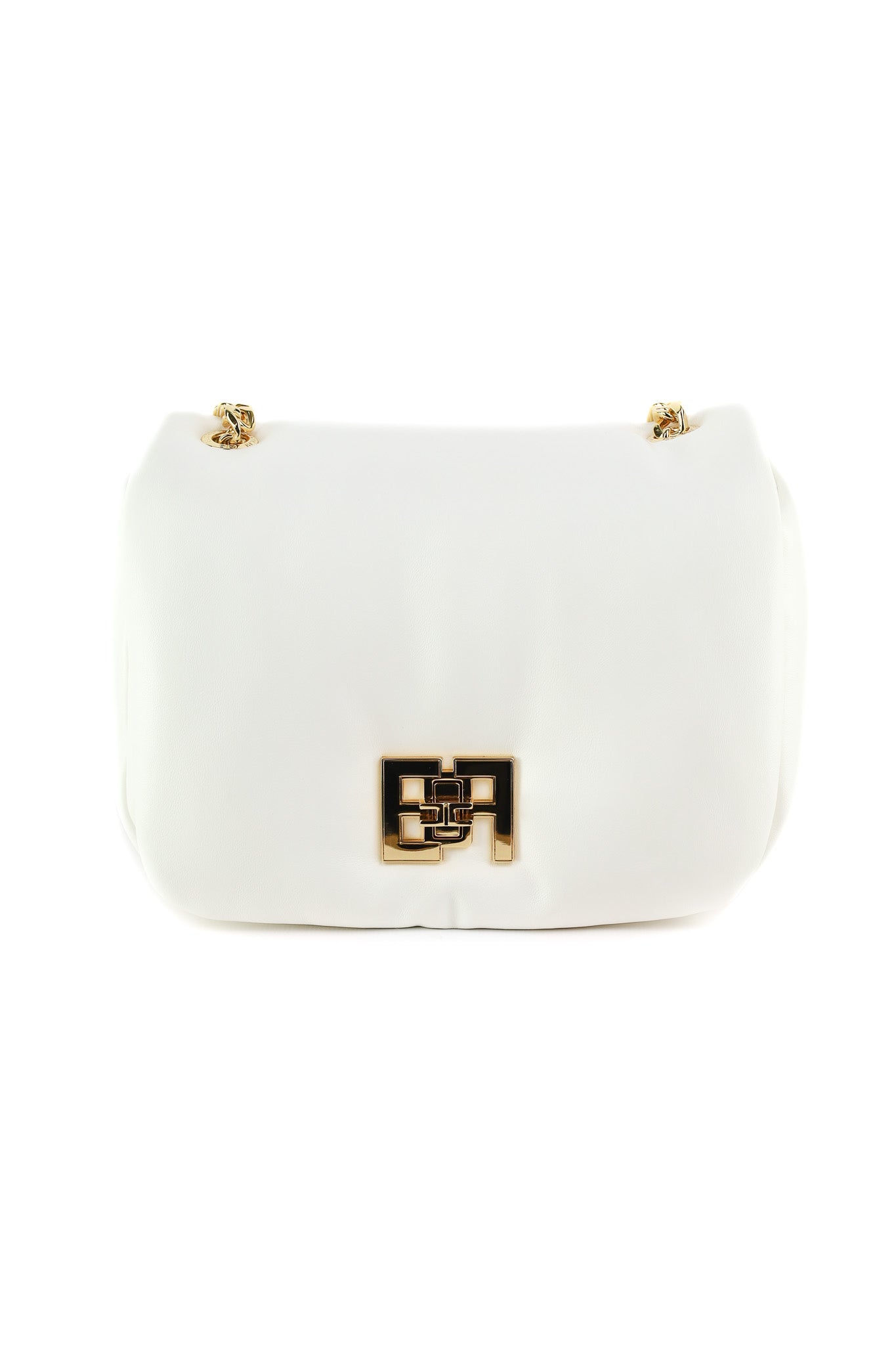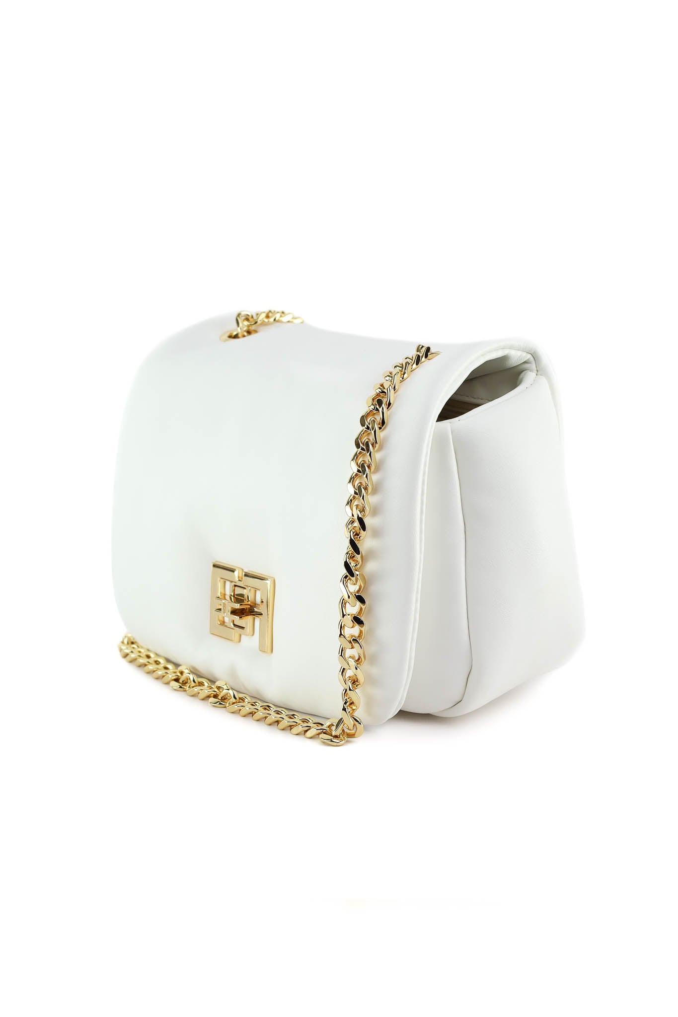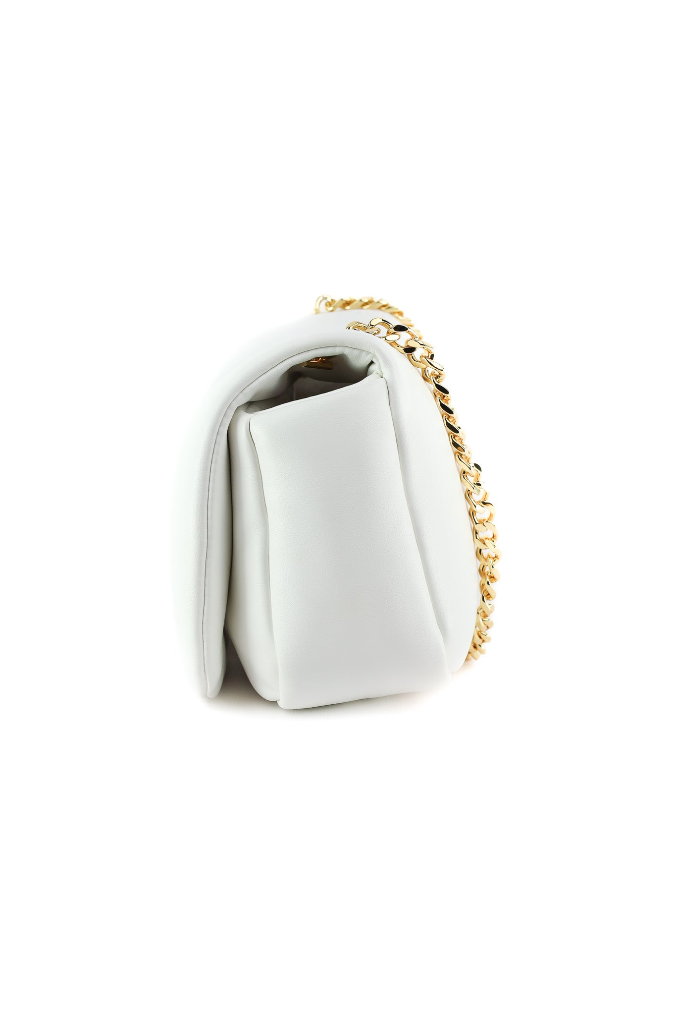 Borsa a tracolla in similpelle bianca lucida, con catena dorata e logo metallico frontale. La forma morbida e compatta la rende perfetta per look minimalisti o luminosi, ideale per il giorno e aperitivi.