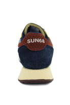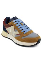 Sneakers da uomo stile running rétro in mix di camoscio senape, nylon grigio e dettagli blu navy, con lacci azzurri a contrasto e logo laterale chiaro che donano un carattere sportivo e contemporaneo facilmente abbinabile a jeans e chino casual. La tomaia leggera e traspirante è abbinata a un’intersuola color avorio che assicura ammortizzazione, mentre la suola in gomma con battistrada garantisce grip e comfort durante l’uso quotidiano.