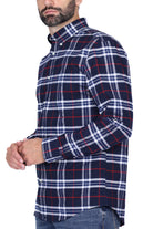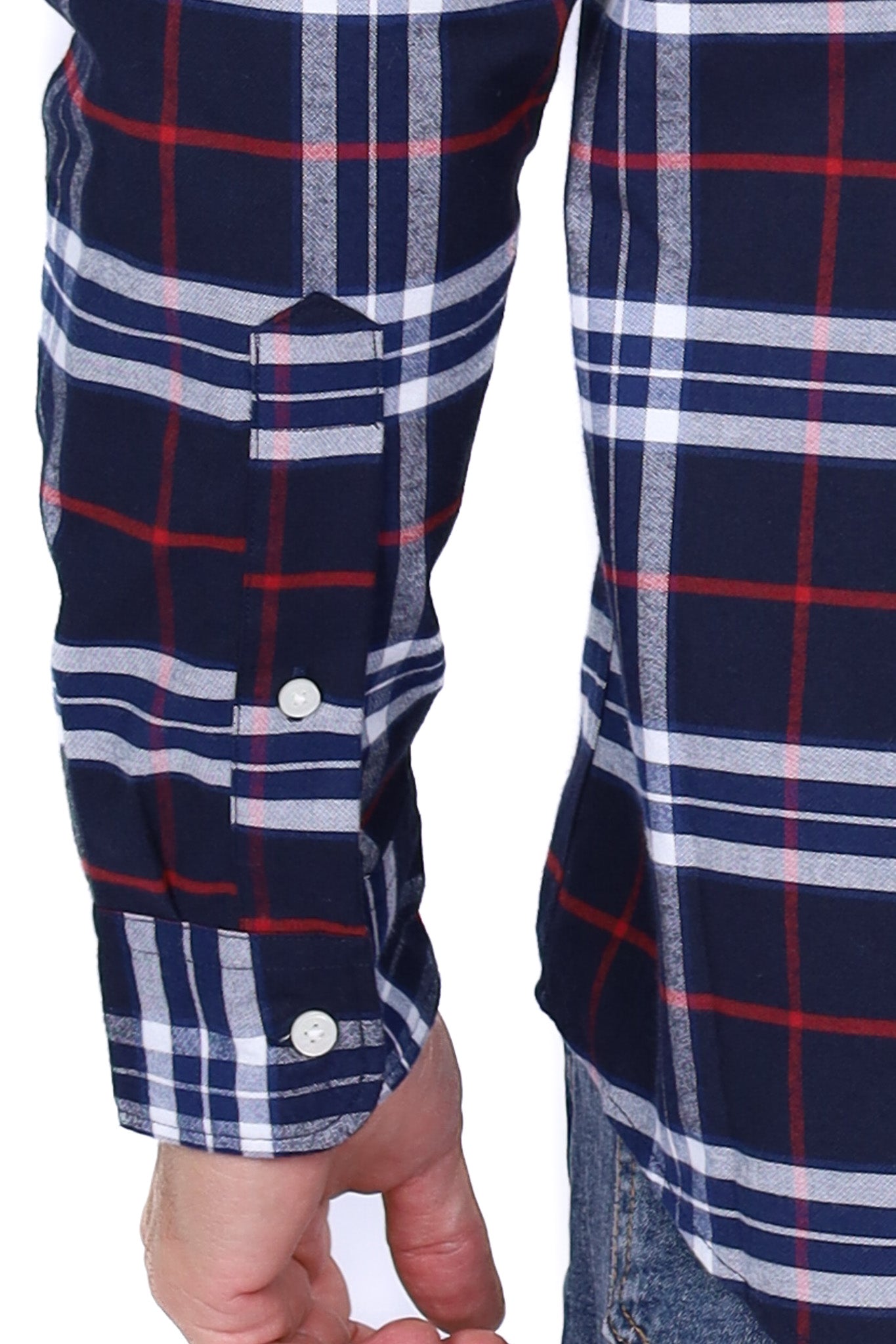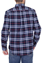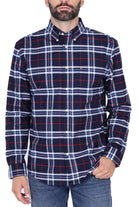 Camicia da uomo in morbido cotone a quadri, con pattern blu, bianco e rosso. Modello a manica lunga con bottoni e colletto button down, perfetta per outfit casual o urban, facile da abbinare con jeans o chinos. Il tessuto leggero la rende ideale per tutte le stagioni e per chi cerca praticità e stile.