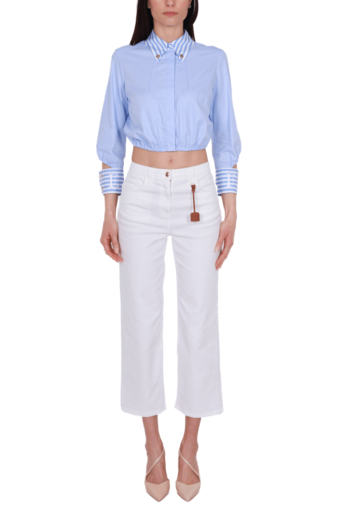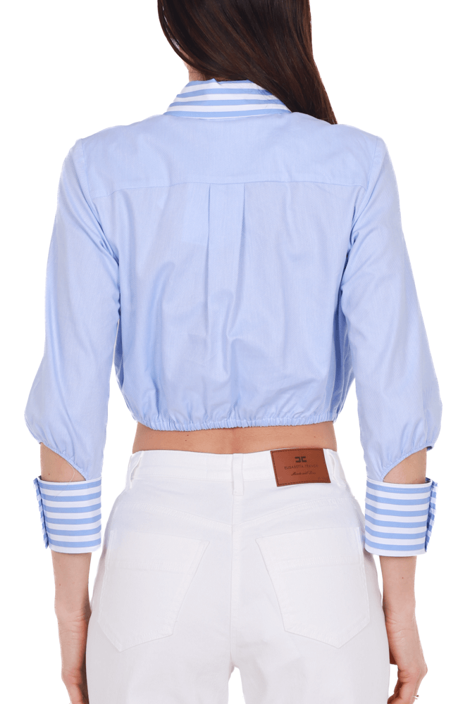 Camicia cropped con elastico al fondo in popeline di cotone e con collo e polsini a righe, modello arricchito da bottoni di metallo color oro