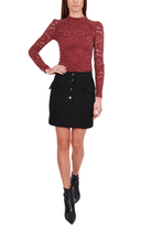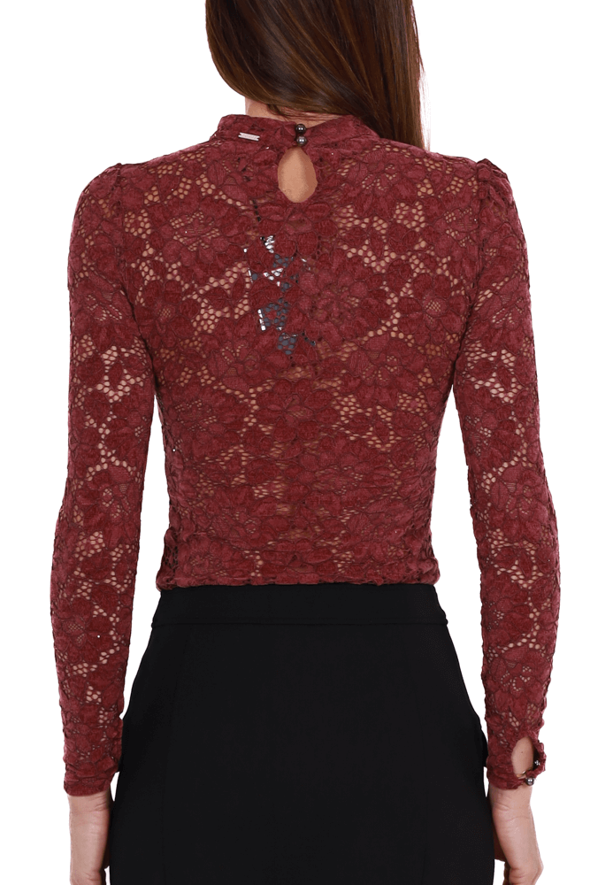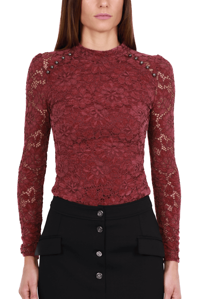 Stretch Lace Long Sleeve Top model with puffed sleeves and decorative buttons on the shoulders