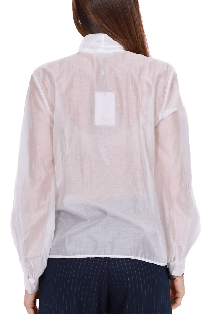 Long-sleeved shirt in vaporous muslin fabric, model with a fitted fit