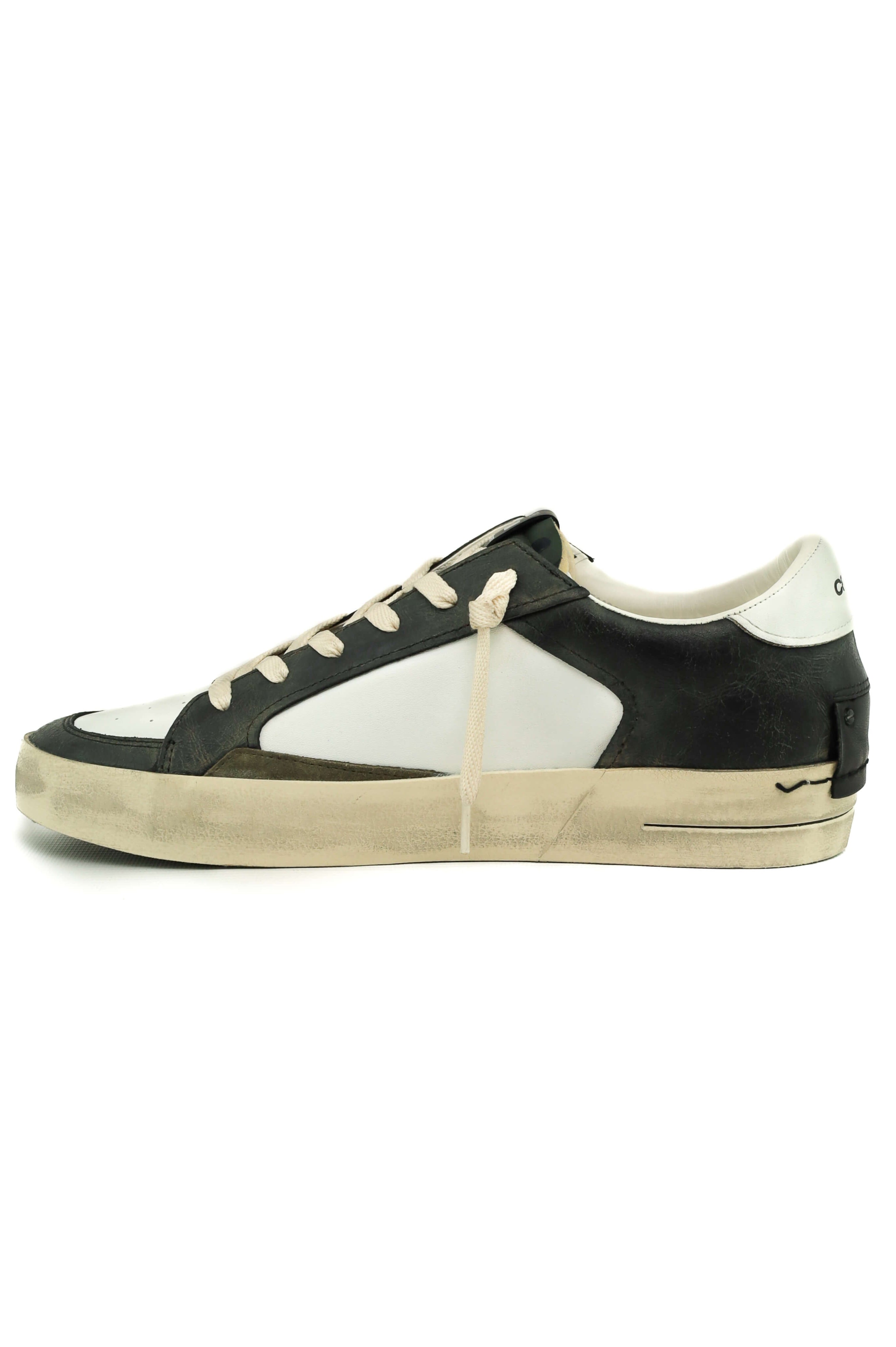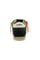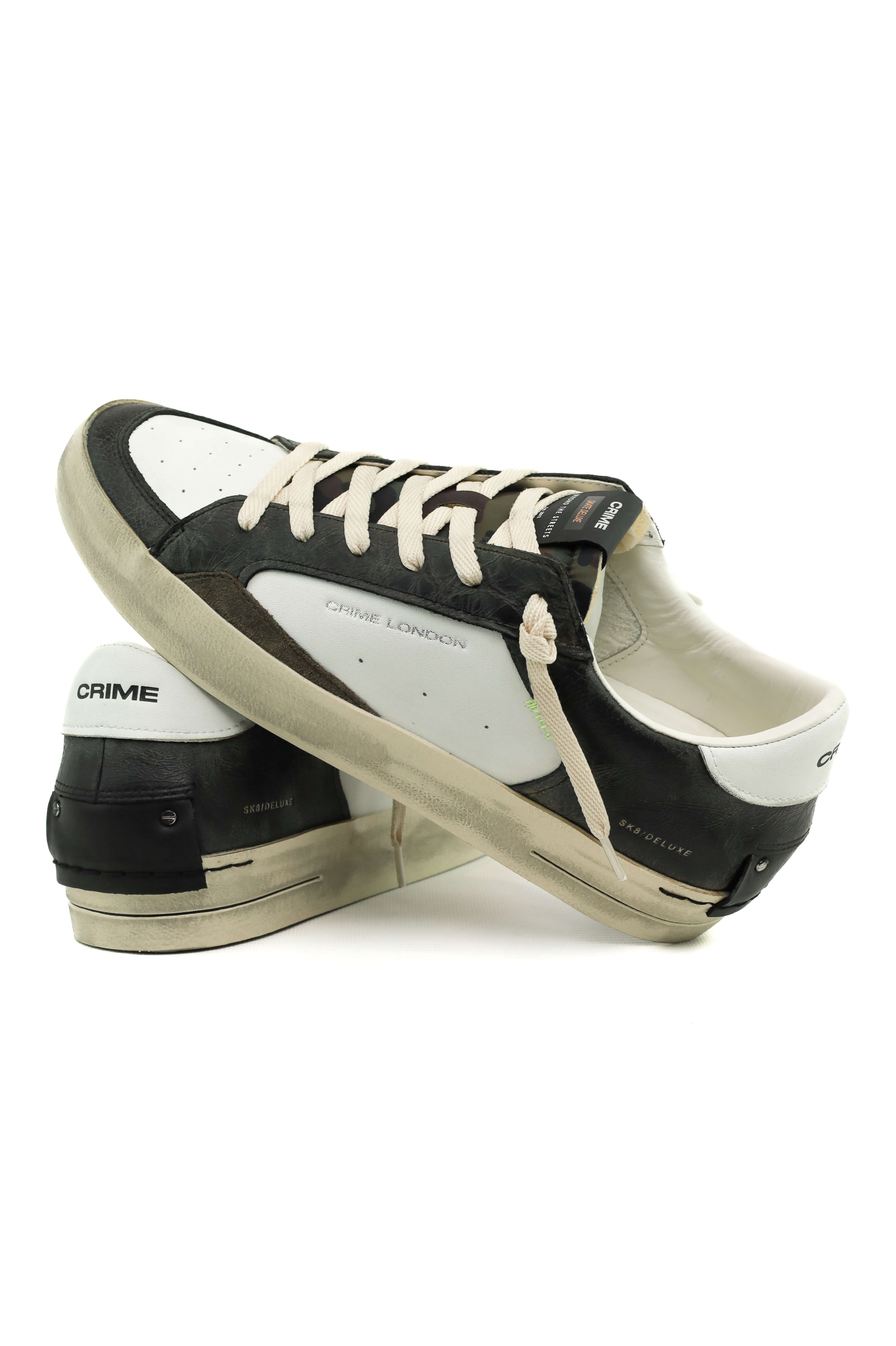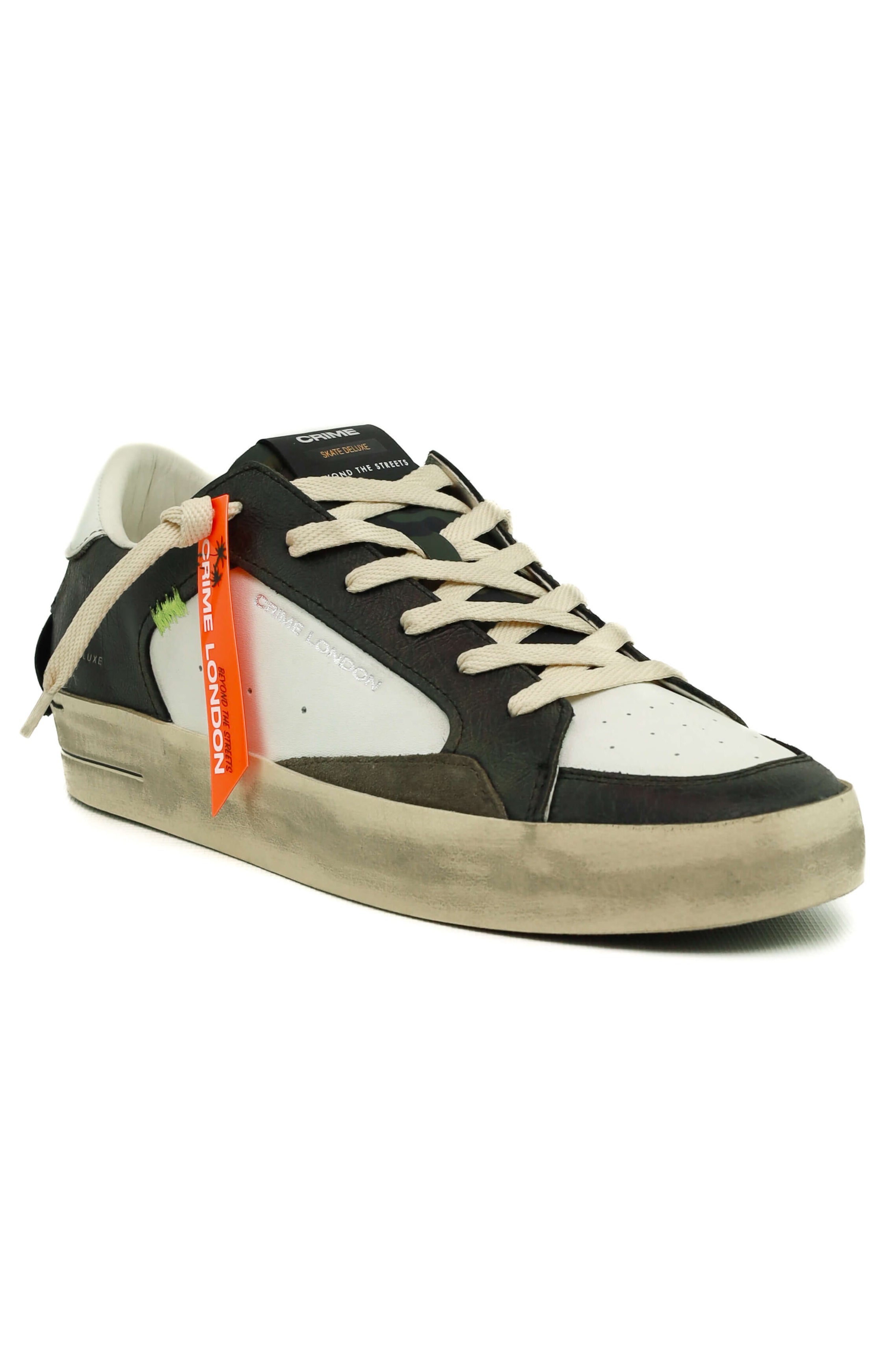 Sneaker bassa dal carattere deciso firmata Crime London. Realizzata in pelle liscia con inserti in suede, presenta dettagli a contrasto e una suola effetto used che dona un look vissuto e autentico. Il tallone arancione fluo aggiunge un tocco contemporaneo e dinamico, mentre le stringhe camouflage richiamano lo stile streetwear.