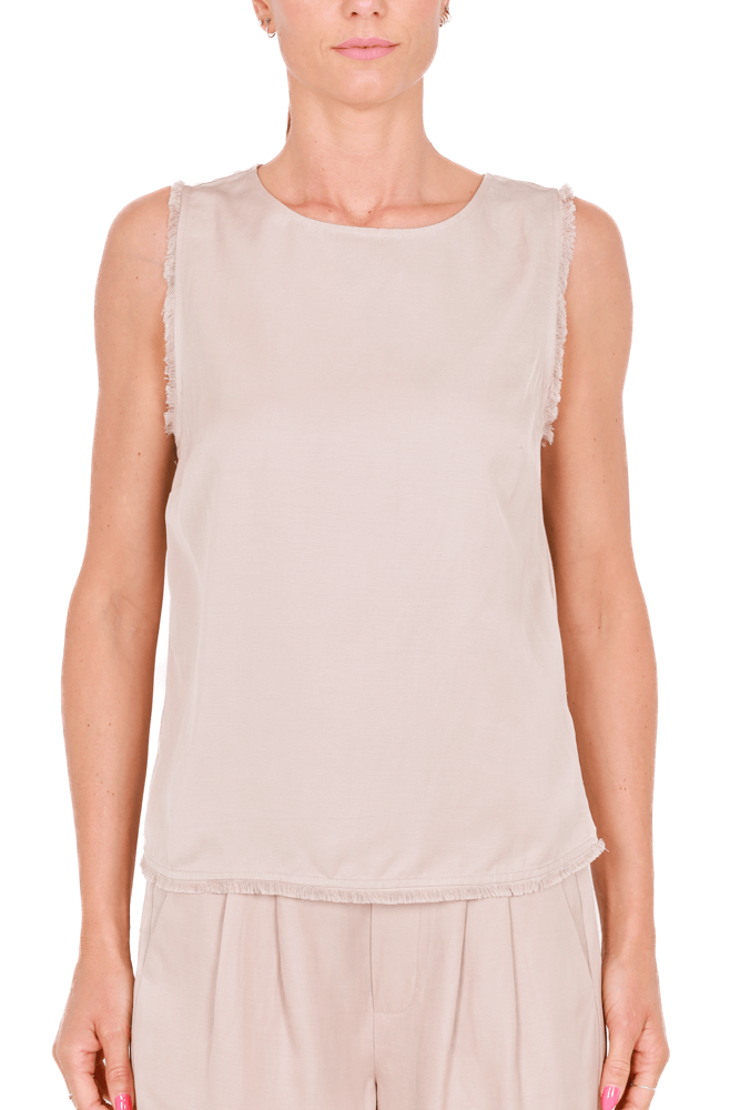 Top smanicato in fresco tessuto di lino e viscosa, modello con orli a taglio vivo