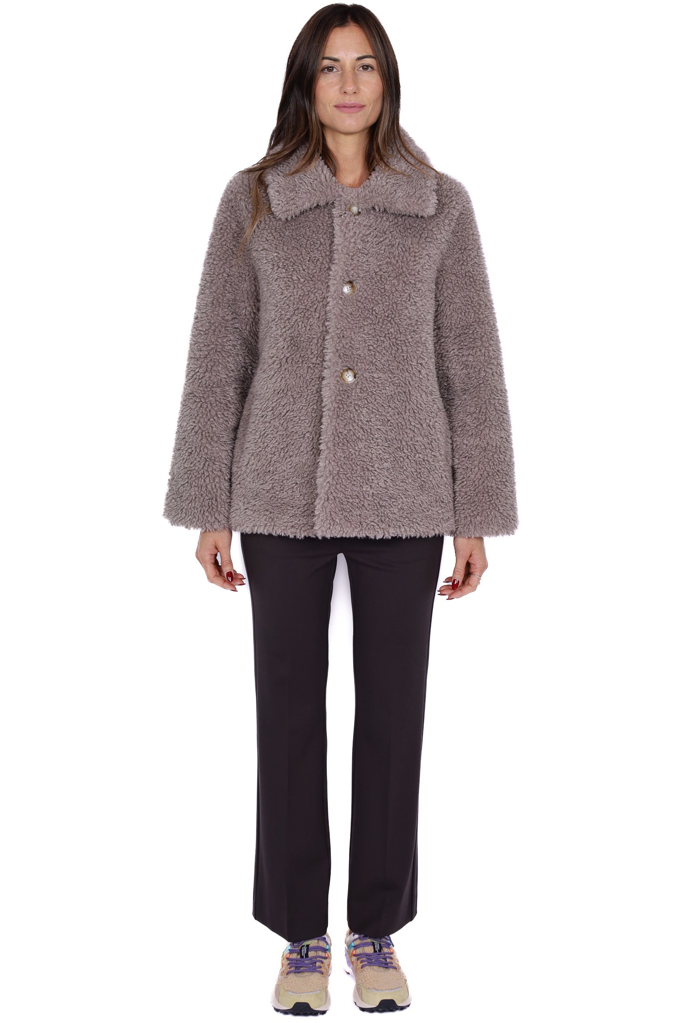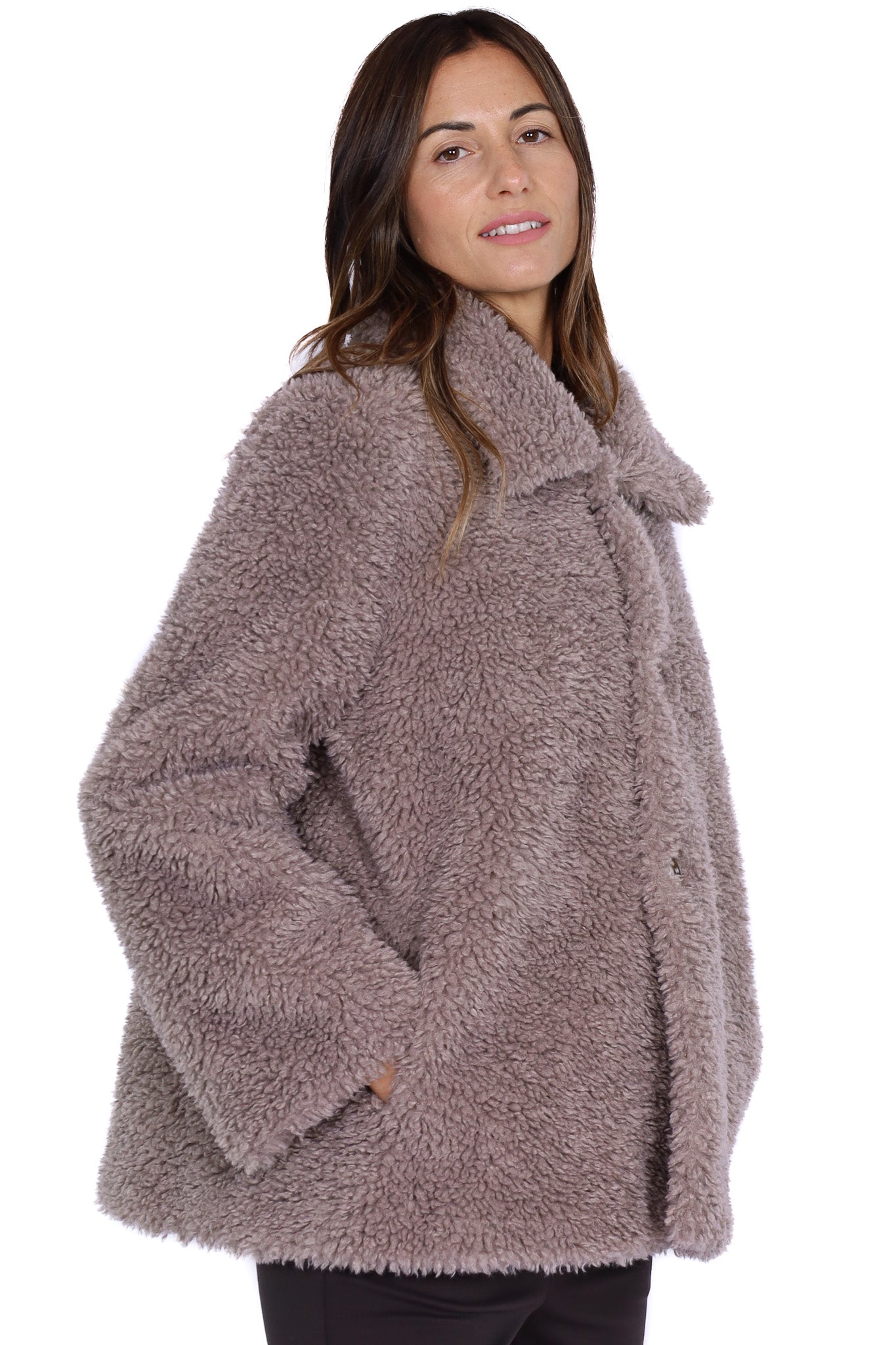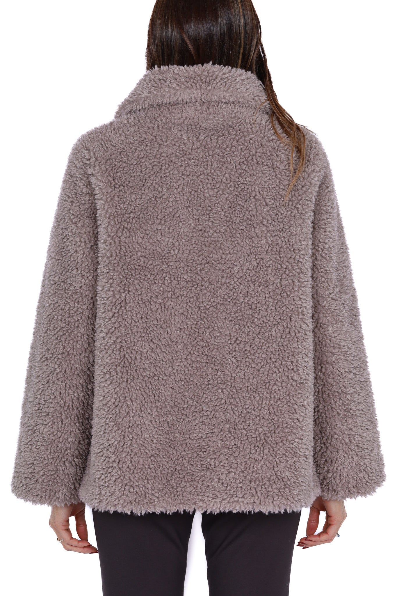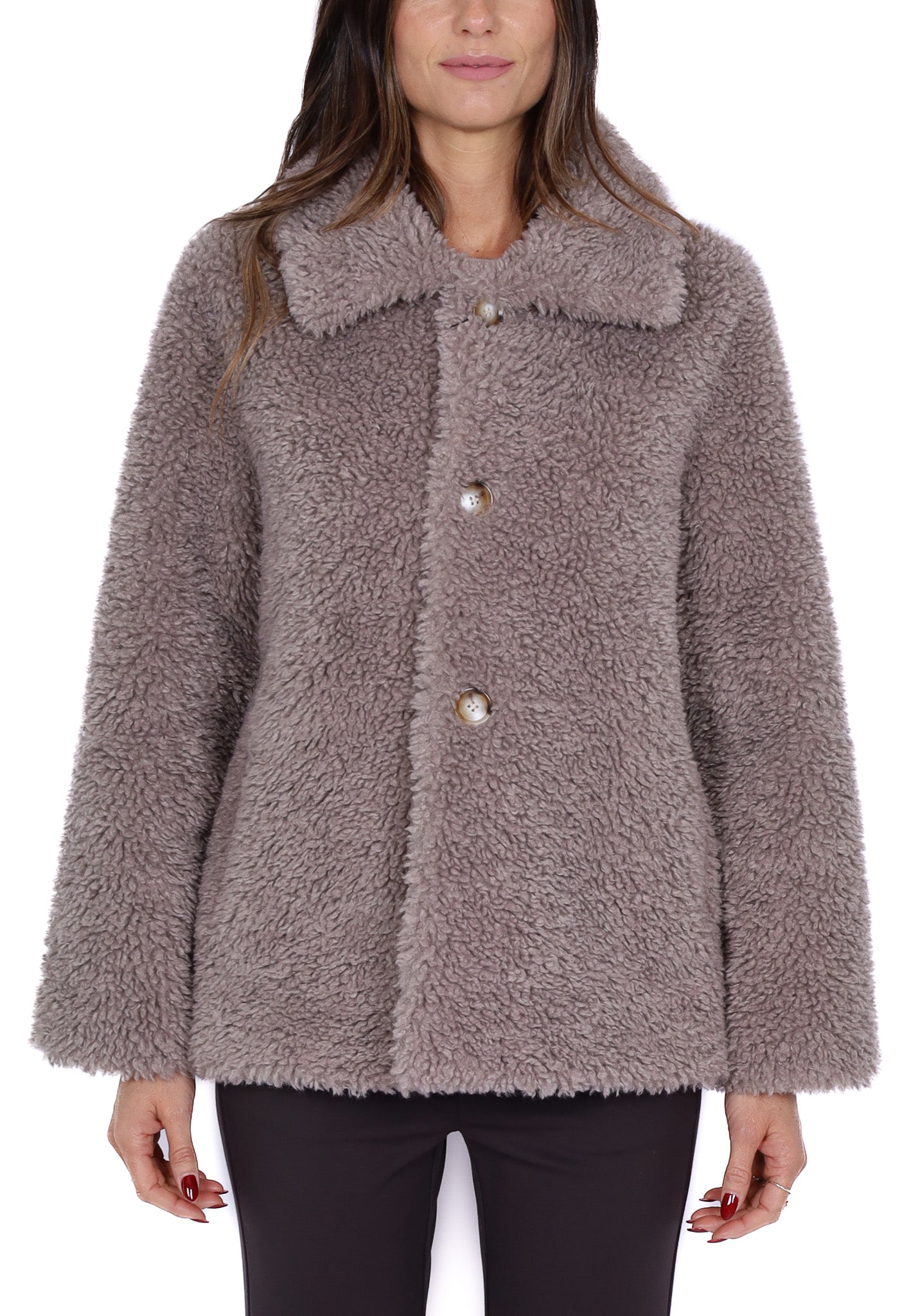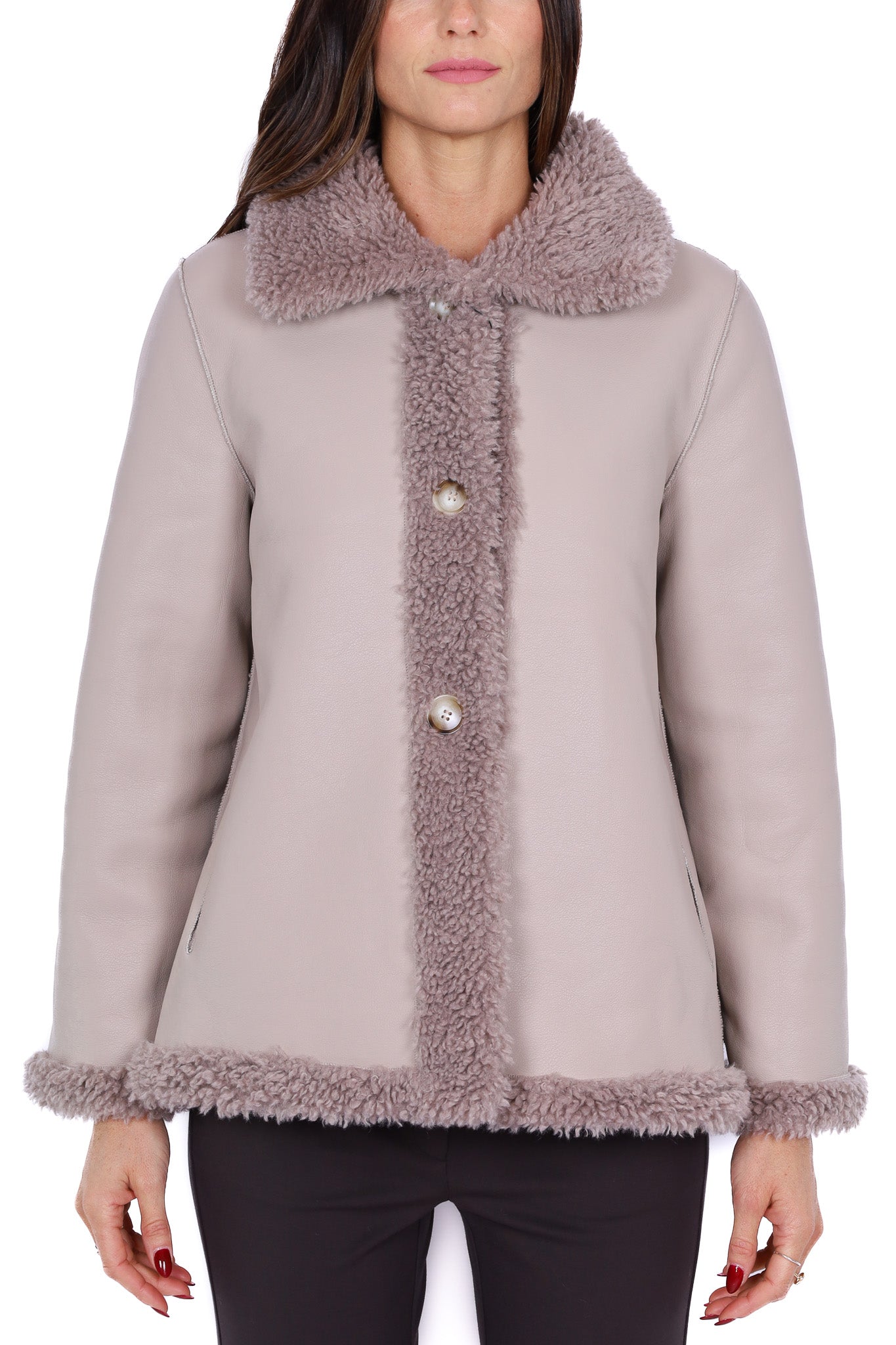 Cappotto corto da donna reversibile in ecopelle color taupe con interno in montone sintetico teddy tono su tono. Un lato mostra una superficie liscia con profili e colletto in montone, chiusura a quattro bottoni e tasche laterali a filo; l’altro lato presenta il total look montone riccio per un’effetto teddy extra morbido e avvolgente. Vestibilità dritta, ideale sia su outfit casual che più eleganti: due stili in un unico capo pratico, caldo e versatile per l’inverno.