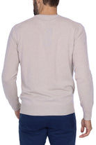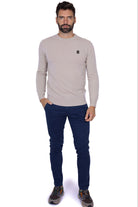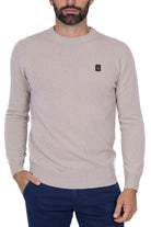 Maglione girocollo da uomo realizzato in morbida lana extrafine, con linea essenziale e pulita. Il colore beige chiaro dona versatilità a qualsiasi outfit, mentre il piccolo patch logo sul petto aggiunge un tocco distintivo e raffinato. Fondo, polsi e collo in maglia a costine per una vestibilità perfetta. Ideale da indossare da solo o sotto una giacca per un look casual elegante.