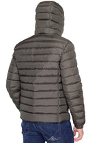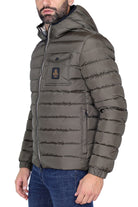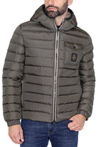 Piumino trapuntato da uomo in tessuto tecnico color verde, leggero e caldo, con cappuccio fisso e chiusura zip. Presenta tasca applicata sul petto con pattina e logo, due tasche laterali e fondo elasticizzato. Adatto per la stagione fredda, è l'ideale per chi cerca uno stile casual, sportivo e pratico, perfetto in città come nel tempo libero.
