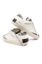 Sneaker bassa da donna firmata Crime London dal carattere deciso e fashion-forward. La tomaia in pelle bianca è impreziosita dal tallone animalier con fantasia maculata e dettagli in suede che conferiscono originalità e tendenza all’insieme. La suola effetto vintage e la finitura glitterata sulla punta aggiungono un tocco glamour, mentre i lacci chiari stampati logati completano il look.