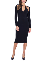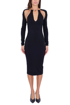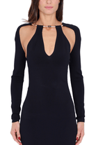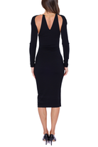 Abito midi da donna in tessuto nero elasticizzato, caratterizzato da una silhouette aderente e dettagli cut out sulle spalle, con scollo profondo e catena dorata decorativa. Maniche lunghe e lunghezza sotto al ginocchio, stile moderno ed elegante perfetto per occasioni speciali e serate. Composizione tessuto 83%Viscosa 17%Poliestere