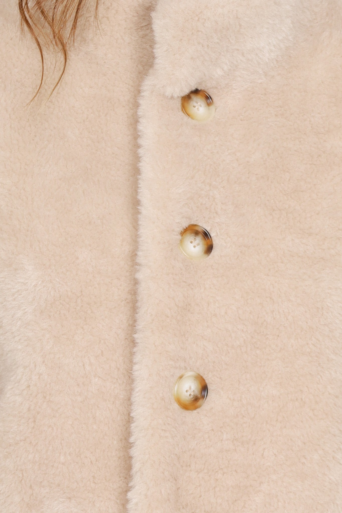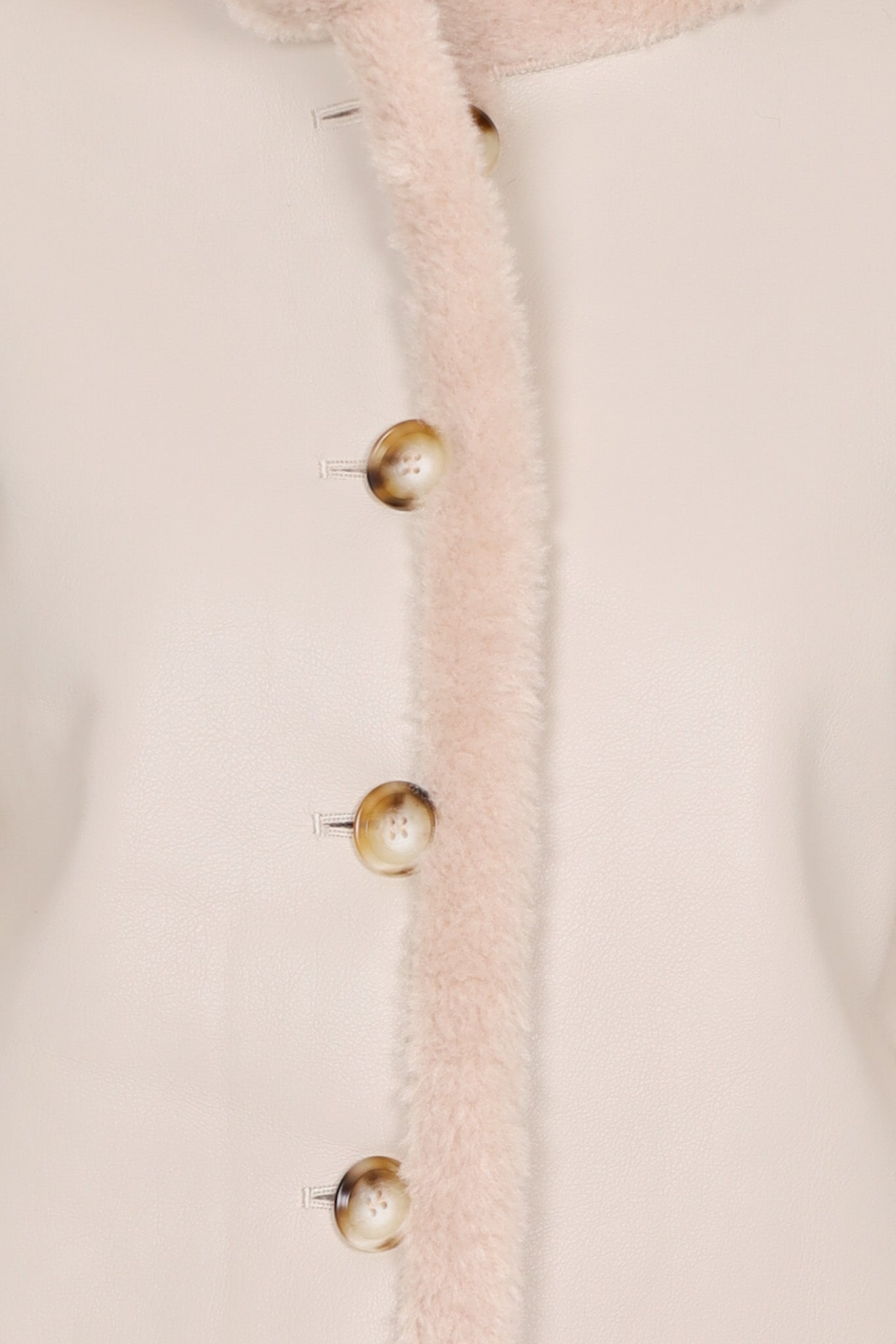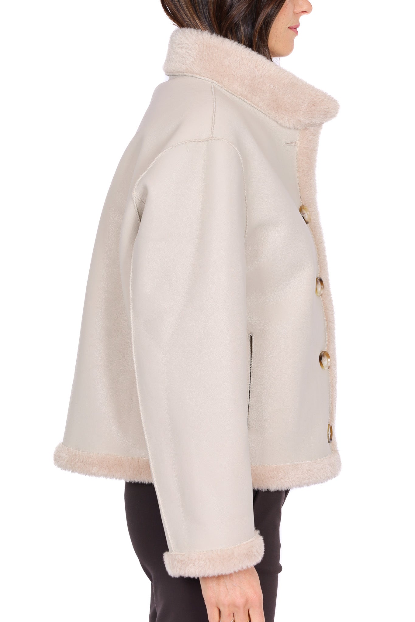 Giubbotto corto da donna in eco pelle chiara con interno effetto montone. Chiusura frontale con bottoni, finiture e interno del colletto in pelliccia sintetica color panna. Il taglio dritto e la texture morbida lo rendono perfetto per un look casual e di tendenza, ideale nelle mezze stagioni e per affrontare le prime giornate fredde. Vestibilità regular, corta sul fondo. Giubbotto reversibile.