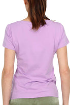 T-shirt scollo ampio con scritta strass e borchie lilla